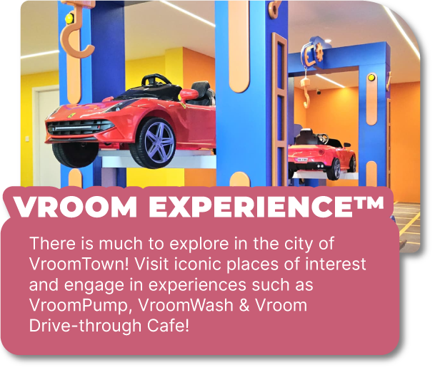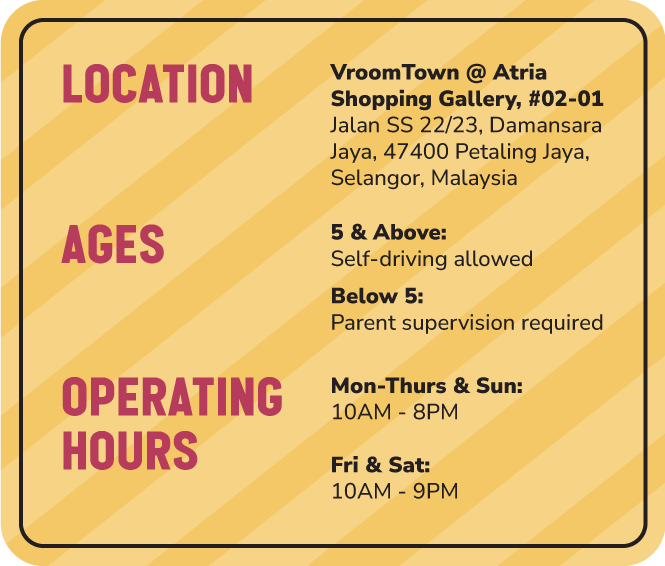 Located at Atria Shopping Gallery in Petaling Jaya, VroomTown™ is a mega indoor drive-play city designed specially for kids! This immersive mini city features exciting real-world zones like a Post Office, Supermarket, Pet Clinic, Mechanic Workshop, Car Wash, Rainbow Expressway, and even a Vroom Café Drive-Through!